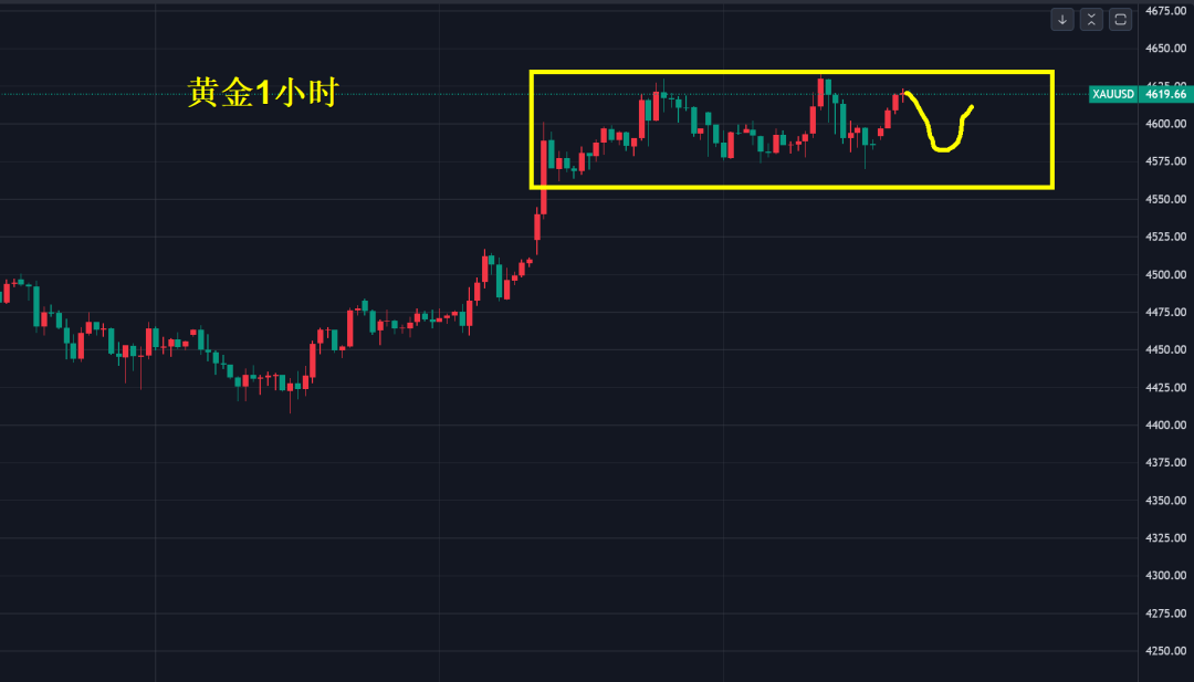 今天我的观点是黄金靠近4630美元压力区域下面区域空,按高位震荡对待,下面关注4580-4570区域离场空然后反手多,另外如果不幸多头直接越过4630美元那就美盘前回落做把手多。