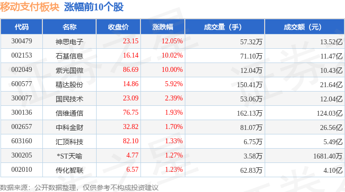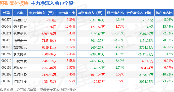 从资金流向上来看,当日移动支付板块主力资金净流出62.19亿元,游资资金净流入13.27亿元,散户资金净流入48.92亿元。移动支付板块个股资金流向见下表: