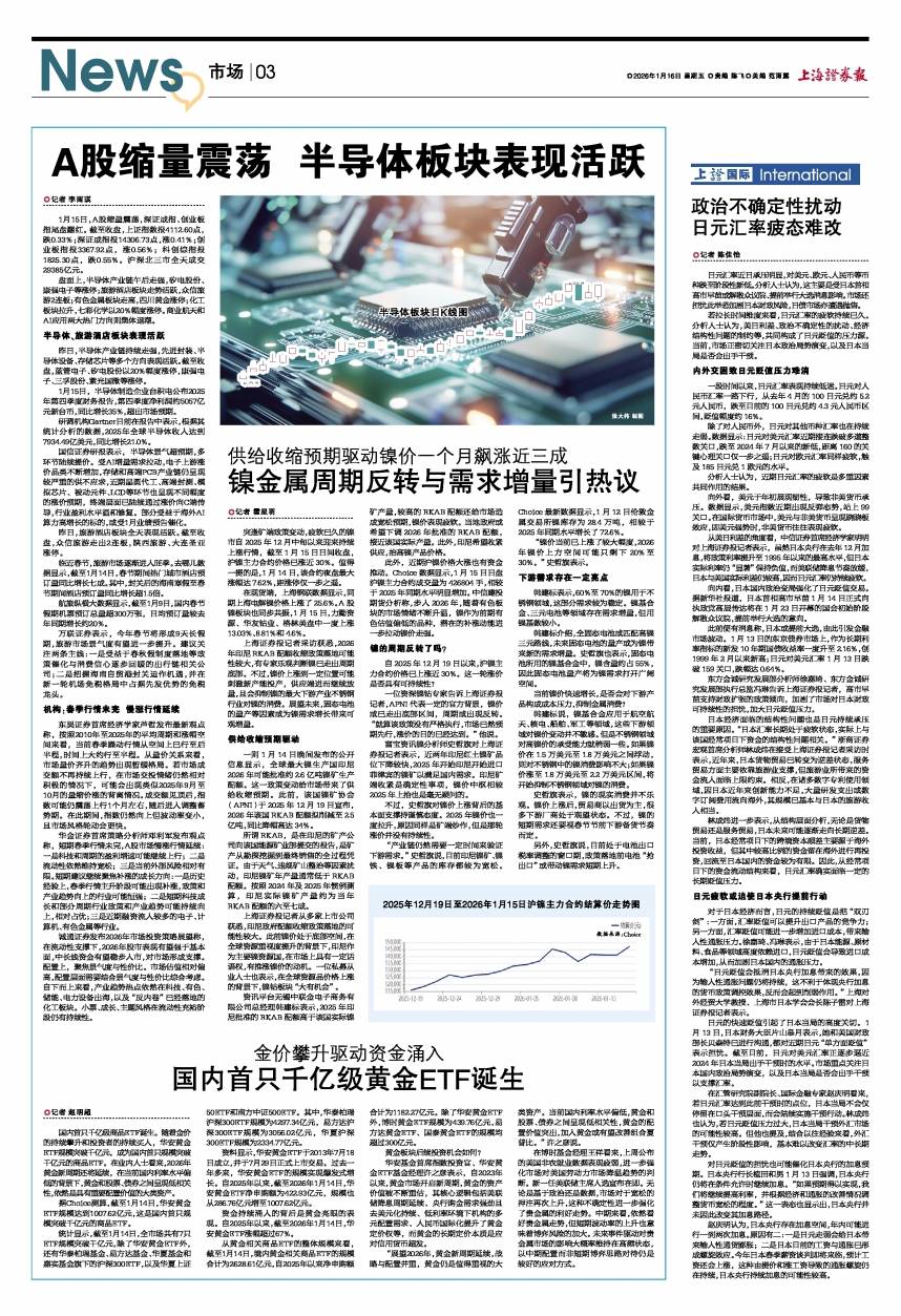 国内首只千亿级商品ETF诞生。随着金价的持续攀升和投资者的持续买入,华安黄金ETF规模突破千亿元,成为国内首只规模突破千亿元的商品ETF。在业内人士看来,2026年黄金新周期还将延续,在当前国内利率水平偏低的背景下,黄金和股票、债券之间呈现低相关性,依然是具有重要配置价值的大类资产。