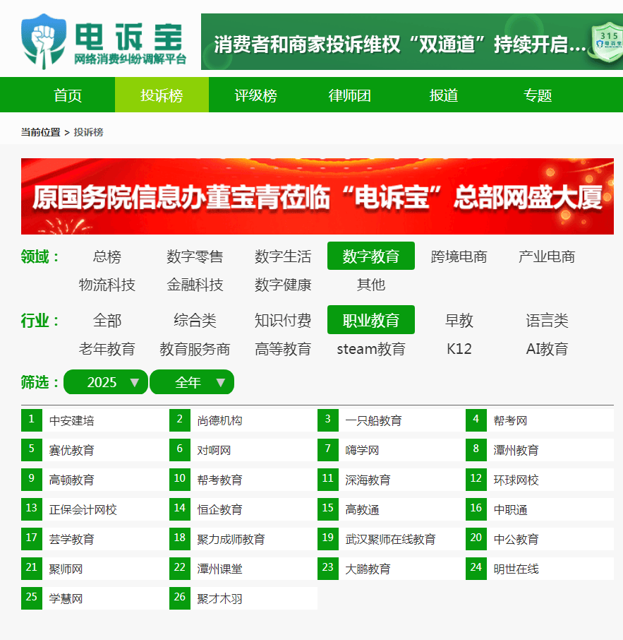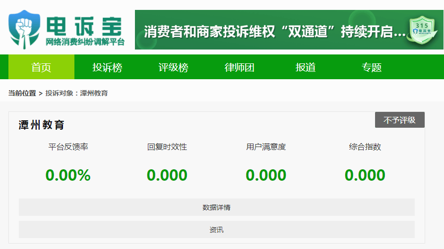 根据“电诉宝”2025年至今受理的职业教育领域用户有效投诉显示(依据投诉量排行),潭州教育排名第8位,最新评级为“不予评级”。