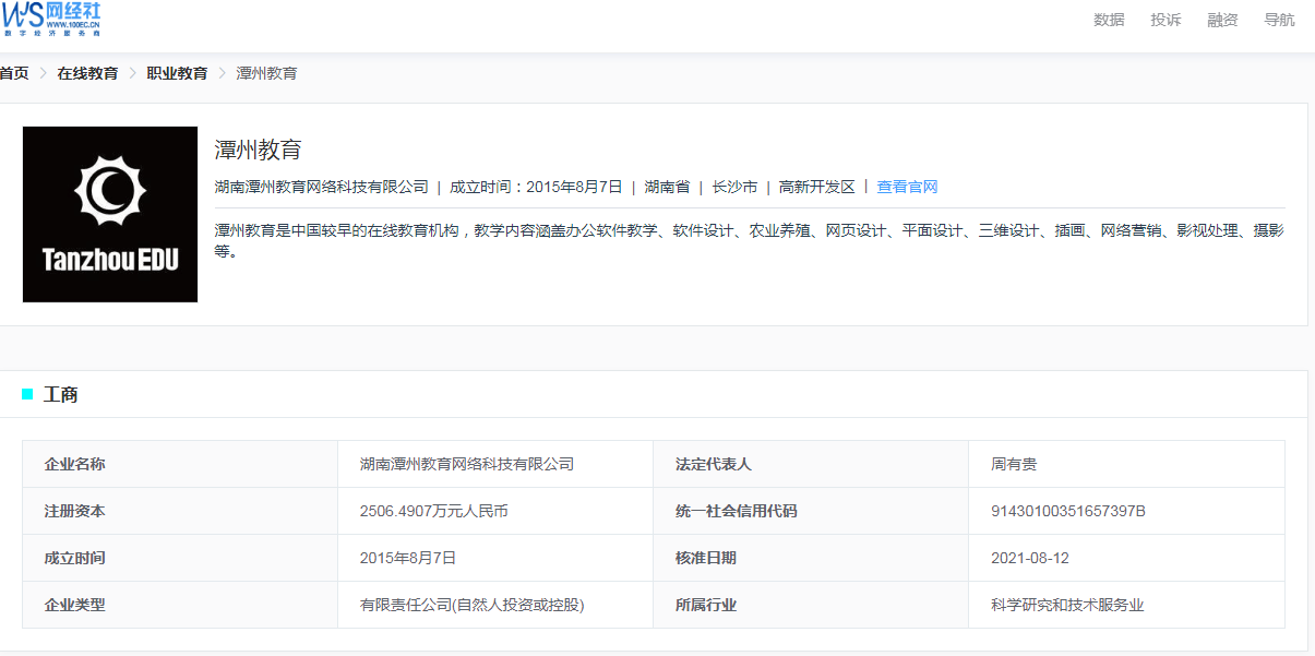 据网经社企业库显示,“潭州教育”隶属于湖南潭州教育网络科技有限公司,法定代表人周有贵。
