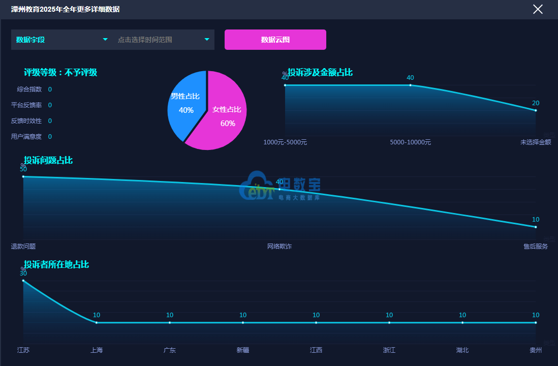 网经社旗下电商大数据库“电数宝”监测数据显示,“潭州教育”2025年投诉的问题主要包括退款问题、网络欺诈等,其中退款问题占比最高,达到了约50%。