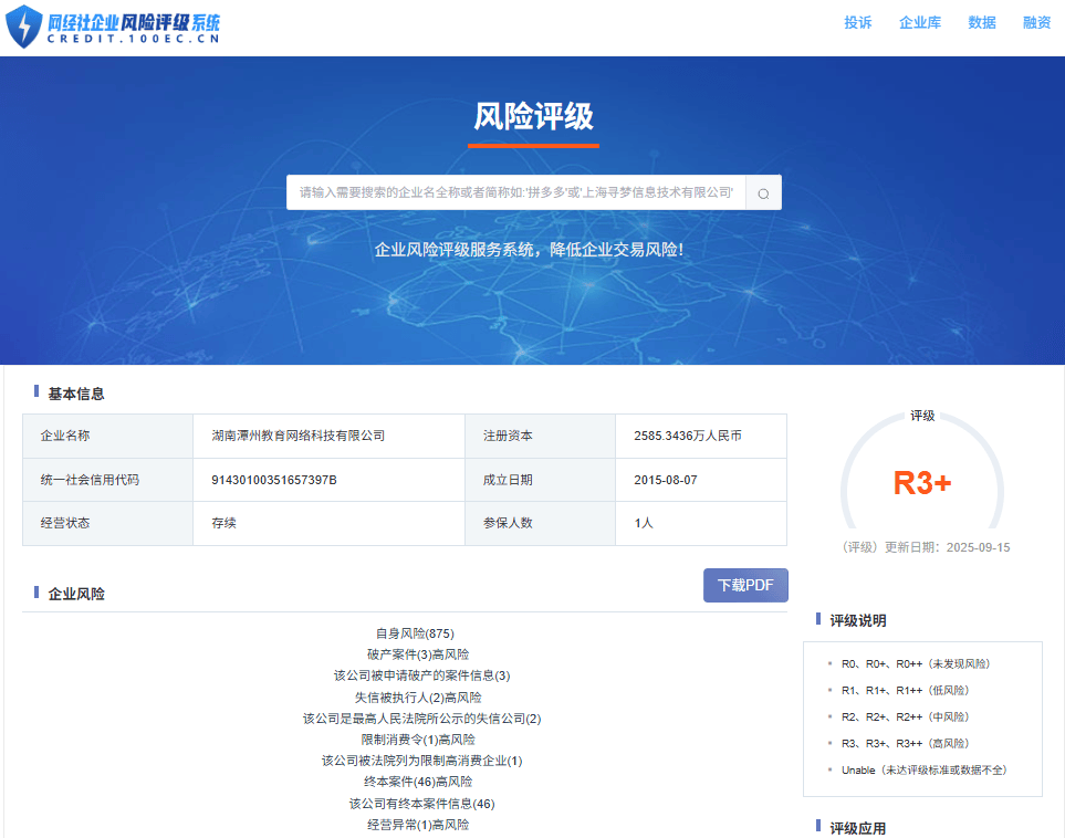 据“网经社企业风险评级系统”显示,潭州教育隶属的湖南潭州教育网络科技有限公司的风险评级为R3+,公司目前所处高风险。
