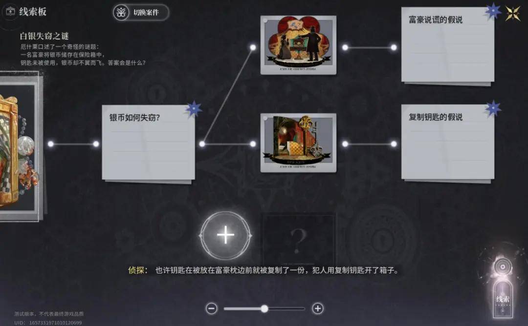 平面部分,就是游戏中的线索板,它能将线索构筑成逻辑脉络进行铺陈,玩家只需把线索放置其中,就能跟随前后的因果关联对案件进行逐步推理,整个推理过程中也会出现诸多假说,需要玩家找寻更多线索去掀翻假说。