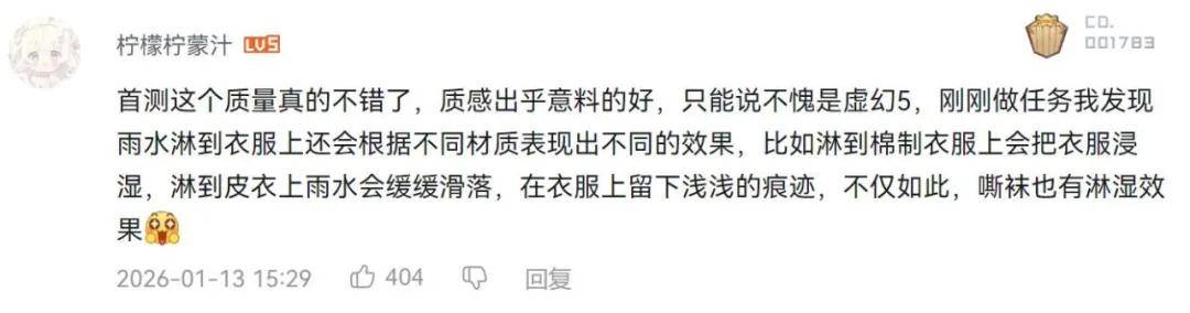 在细节刻画上,游戏也做得非常到位,比如雨中会被打湿的衣服,踩水时溅起的水花。