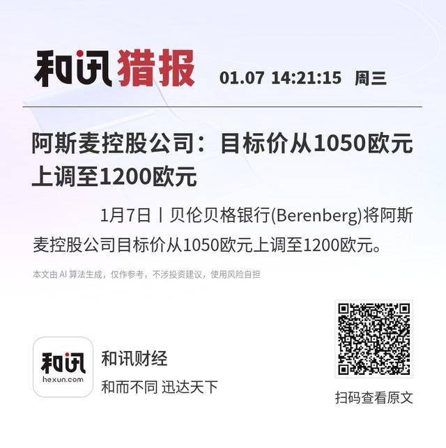 1月7日丨贝伦贝格银行(Berenberg)将阿斯麦控股公司目标价从1050欧元上调至1200欧元。