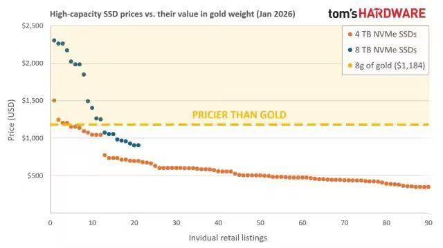 科技媒体 Tom's Hardware 昨日(1 月 16 日)发布博文,报道称受人工智能芯片短缺影响,大容量 NVMe 固态硬盘(SSD)价格飙升,部分型号的“重量单价”已超越黄金。