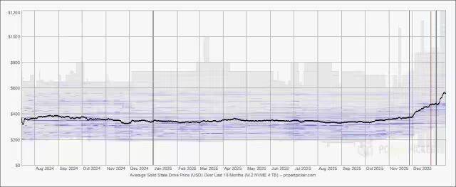 PCPartPicker 的价格追踪曲线清晰地展示了这一趋势:过去两个月内,4TB SSD 的价格出现了剧烈攀升。图表中价格分布范围的扩大(灰色区域),暗示着旧价格体系下的库存正在逐渐消失。
