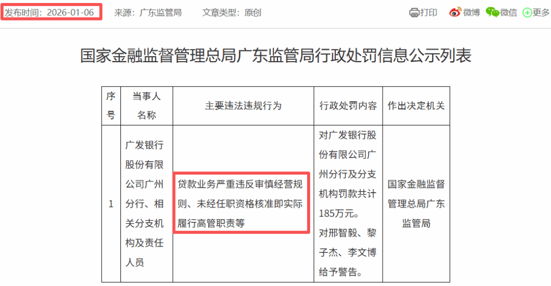 来到2026年,罚单情况仍有出现——2026年1月初,广发银行2个分支机构接连被罚,即新会支行与广州分行,违规问题均涉及贷款业务严重违反审慎经营规则。