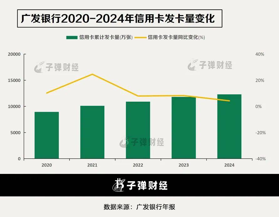 其中,广发银行的信用卡累计发卡量从2020年的8934万张,增长至2024年的1.23亿张,这五年的发卡量同比增速分别是10.21%、24.6%、7.92%、8.26%和4.24%。