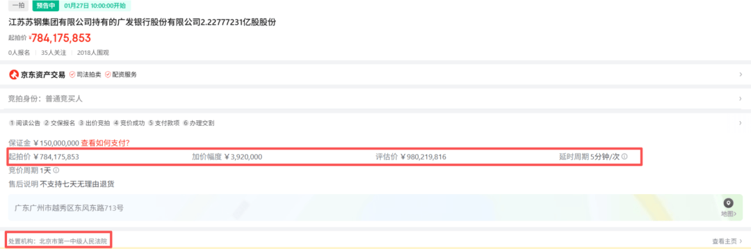 (图 / 广发银行第八大股东江苏苏钢集团的股权拍卖项目(来源:京东拍卖官网))
