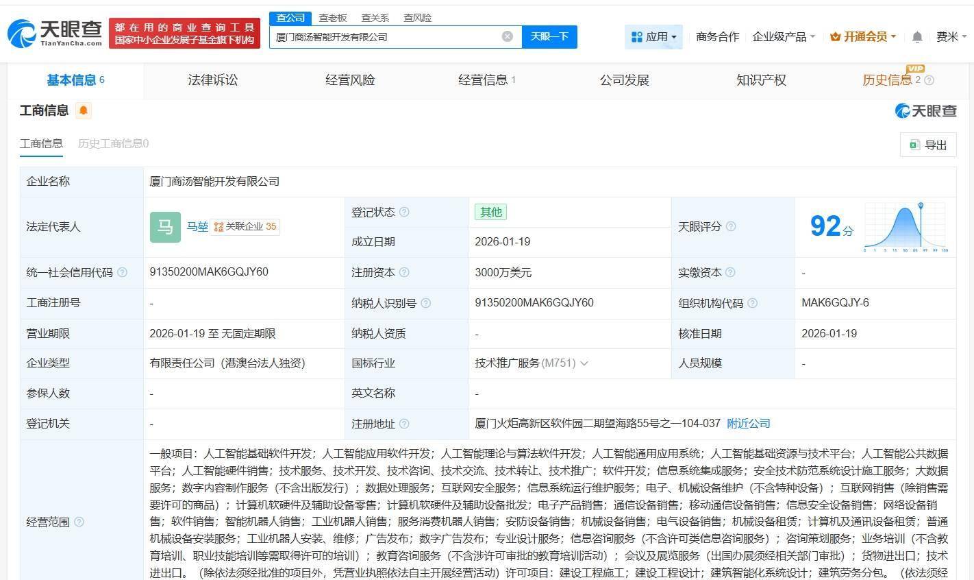 天眼查工商信息显示,1月19日,厦门商汤智能开发有限公司成立,法定代表人为马堃,注册资本3000万美元,经营范围包括人工智能基础软件开发、人工智能应用软件开发、人工智能理论与算法软件开发、人工智能通用应用系统等。股东信息显示,该公司由商汤集团有限公司全资持股。