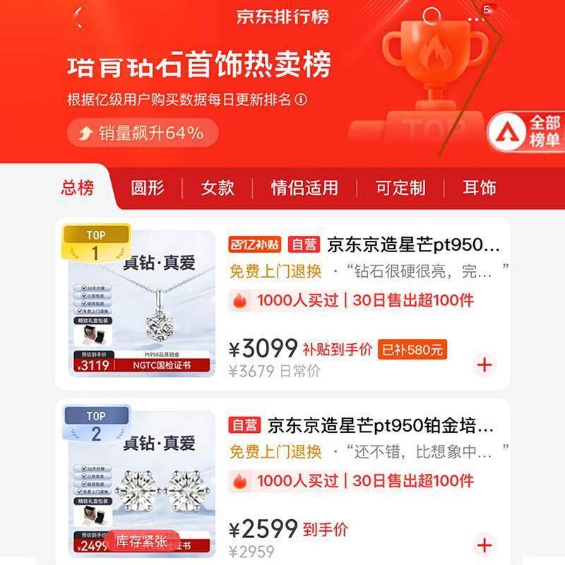 高性价比:1克拉培育钻石+铂金材质,价格却远低于同级别天然钻石饰品。