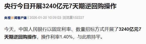 今天,中国人民银行以固定利率、数量招标方式开展了3240亿元7天期逆回购操作,操作利率1.40%,与此前持平。