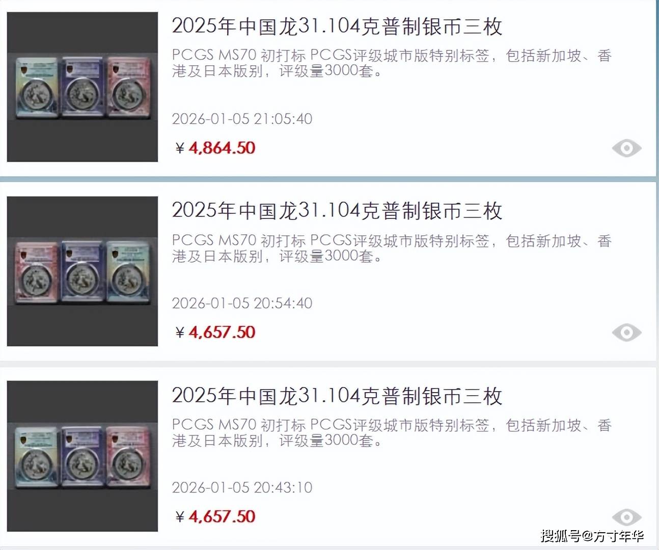 含新加坡、香港、日本版本的三枚套装(PCGS MS70 初打标),成交区间在 4657.50-4864.50 元;