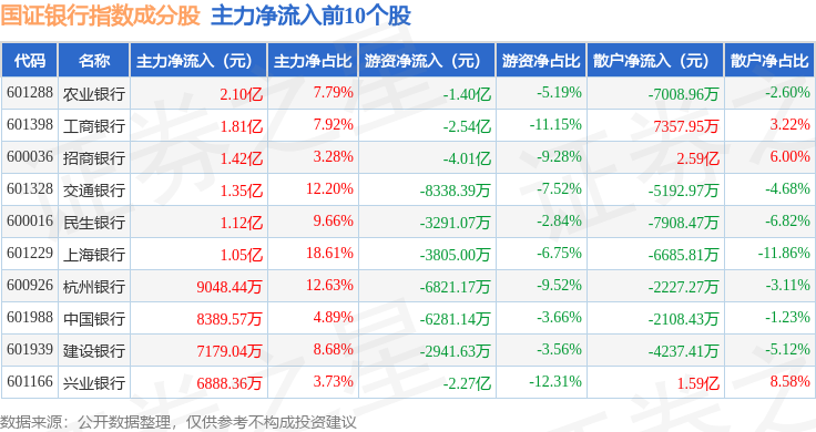 资金流向方面,国证银行(399431)指数成份股当日主力资金净流入合计13.52亿元,游资资金净流出合计13.3亿元,散户资金净流出合计2195.21万元。成份股资金流向详情见下表: