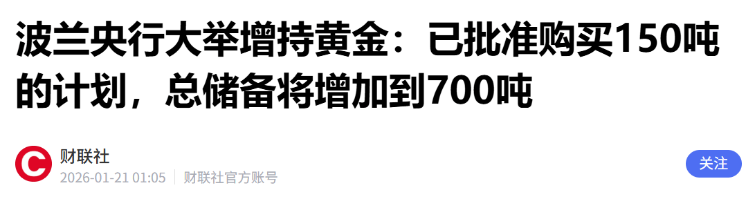 2026年1月21日,波兰国家银行刚刚宣布最新计划:再买入150吨黄金,把官方储备从约550吨一口气提到700吨,按当前金价需动用近230亿美元,规模超过巴西、墨西哥等经济体的全部黄金储备,成为近期最“激进”的买家。
