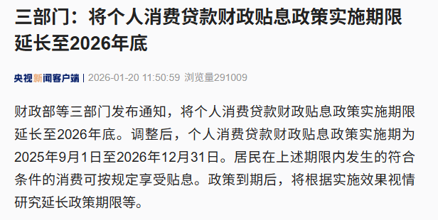 ✅1月20日,财政部等三部门发布通知,将个人消费贷款财政贴息政策实施期限延长至2026年底。