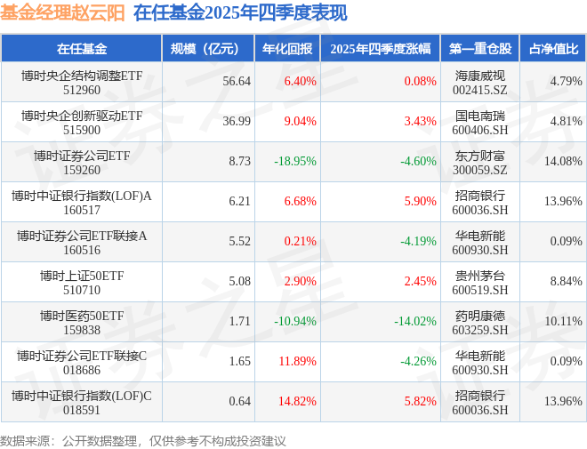 证券之星消息,截止2025年四季度末,基金经理赵云阳旗下共管理9只基金,本季度表现最佳的为博时中证银行指数(LOF)A(160517),季度净值涨5.9%。