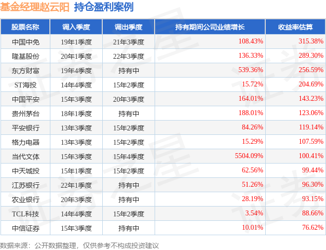 赵云阳管理的博时创业板ETF联接A基金在15年1季度买入中天城投,在持有1个季度后在15年2季度卖出。持有期间的估算收益率为99.44%,持有期间中天城投在2014年到2015年的年报归属净利润增幅达62.56%。