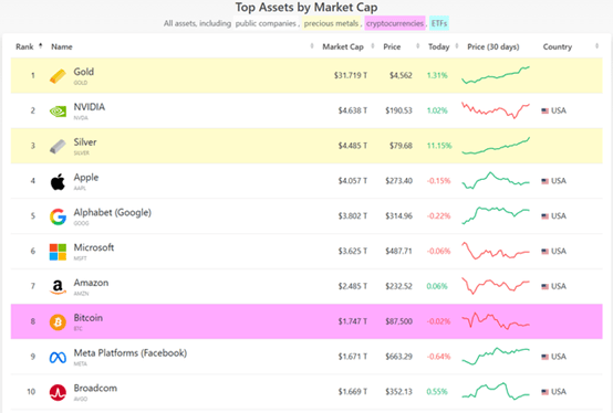 财联社12月29日讯(编辑 卞纯)随着白银价格不断攀升,目前该贵金属市值已超越苹果,晋升为全球第三大资产,仅低于黄金和英伟达。