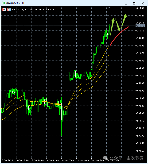 一句话看懂黄金Gold:仍处于强势拉升阶段,短线无大回调征兆,依托均线系统继续创新高。