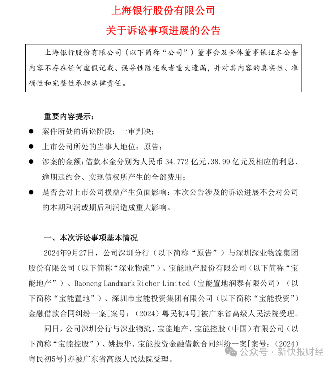 根据上海银行此前发布的诉讼事项公告,上述金融借款纠纷系宝能系企业借款逾期。2018年9月、10月,上海银行深圳分行通过认购信托资金向深业物流分别放款人民币15亿元、23亿元,到期日分别为2021年9月26日、2021年10月18日。担保方式为深业物流、宝能地产提供不动产抵押担保,宝能置地提供股权质押等担保,宝能投资提供连带责任保证担保。截至起诉日,深业物流尚欠本金34.772亿元及利息等。