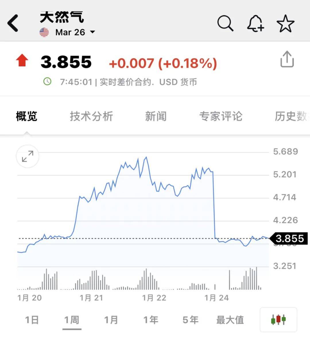 美东时间1月26日下午,天然气近月合约价格涨破7美元/百万英热,为2022年以来首次,较上周五收盘价上涨40%。