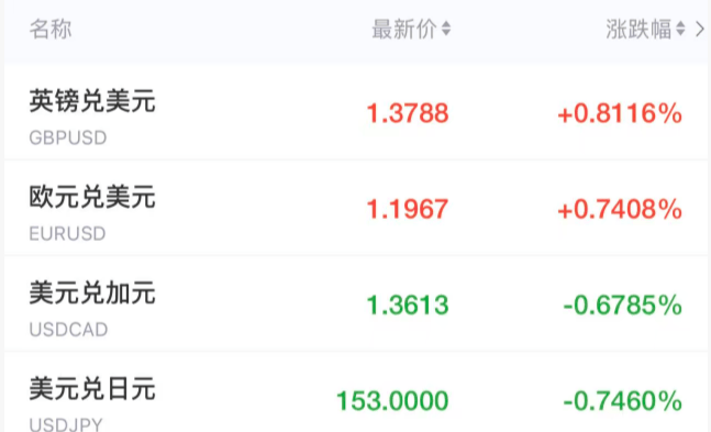 英镑兑美元上涨0.8%至1.3788,为2021年10月以来的最高点;美元/日元下跌0.7%,至153;欧元兑美元上涨0.74%,至1.1967。