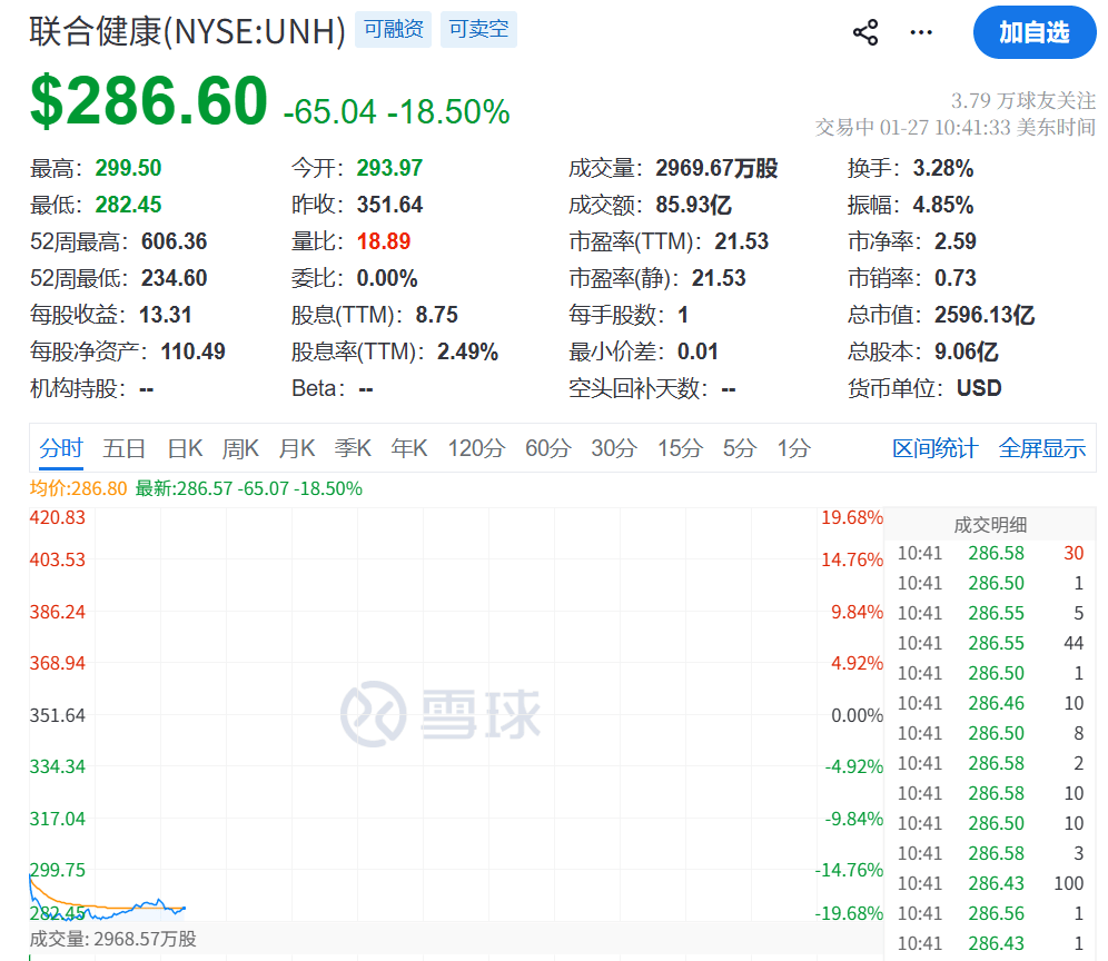 道琼斯指数的下跌,主要受到了联合健康暴跌近20%的影响。消息面上,联合健康集团预计其 2026年营收将下降,这将是该公司三十多年来首次出现年度营收收缩。在去年股价遭遇重挫后,这家保险巨头试图重建投资者信心,但进展不顺。