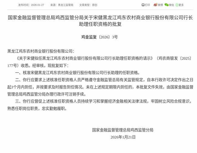 2026年1月27日,根据国家金融监督管理总局消息,《关于宋健拟任黑龙江鸡东农村商业银行股份有限公司行长助理任职资格的请示》获得通过,批复宋健黑龙江鸡东农村商业银行股份有限公司行长助理的任职资格。