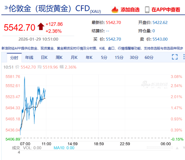 国际黄金期货价格和现货价格29日再创新高。截至北京时间29日上午10时,伦敦现货黄金价格已突破5540美元/盎司,较昨日价格再涨2%以上。