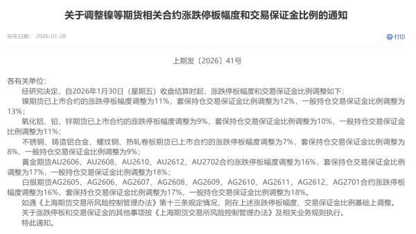 同日,上海期货交易所也发布通知称,自2026年1月30日(星期五)收盘结算时起,对部分类型期货的涨跌停板幅度和交易保证金比例进行调整。