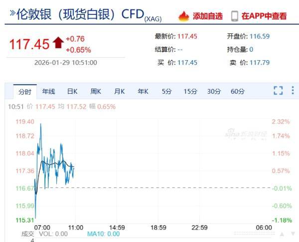 与黄金类似的,白银价格也在近期持续猛涨。截至北京时间29日上午10时,伦敦现货白银价格突破117美元/盎司,较昨日价格上涨约0.65%。