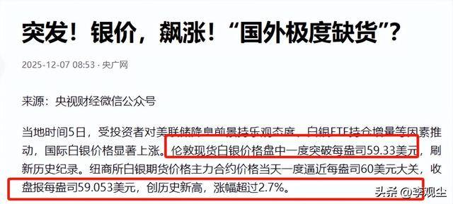 抢货潮带来的直接影响,就是价格的飙升,伦敦现货白银价格一度突破每盎司59.33美元,刷新历史纪录,纽商所白银期货主力合约更是逼近每盎司60美元大关。