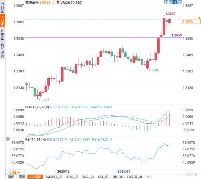 技术面亮起警示灯,行情或进入震荡期 从技术图形来看,英镑兑美元日线级别已完成一轮快速拉升,目前处于高位整理阶段。此前最高触及1.3867一线,随后小幅回落至1.3830附近消化获利盘。虽然整体趋势仍偏多,但部分指标已显现过热迹象。相对强弱指标(RSI)当前位于74.5547,接近超买区域,显示短期追涨的风险正在上升。通常在这种情况下,价格更倾向于通过横盘震荡或小幅回踩来修复技术结构,而非继续直线拉升。