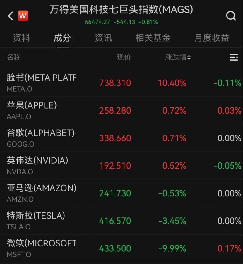 美国大型科技股多数上涨,万得美国科技七巨头指数跌0.81%。个股方面,META涨逾10%;苹果、谷歌涨近1%,英伟达涨0.52%,亚马逊跌0.53%,特斯拉跌3.45%;微软股价重挫,跌近10%。