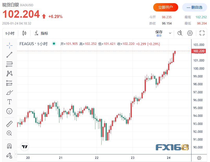 美盘时段,在突破100美元/盎司大关后,现货白银持续上涨并接连突破101和102美元/盎司,日内涨超5美元,续创新高,日内涨幅超6%。