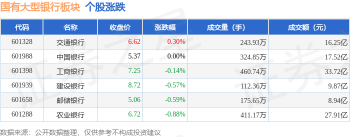 从资金流向上来看,当日国有大型银行板块主力资金净流出2.46亿元,游资资金净流出2.46亿元,散户资金净流入4.92亿元。国有大型银行板块个股资金流向见下表: