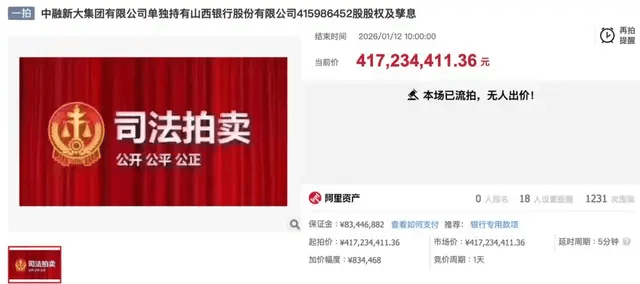 1 月 12 日,第四大股东中融新大所持 4.16 亿股股权司法拍卖落幕,4.17 亿元起拍价、1231 次围观,最终却 0 人报名,黯然流拍。