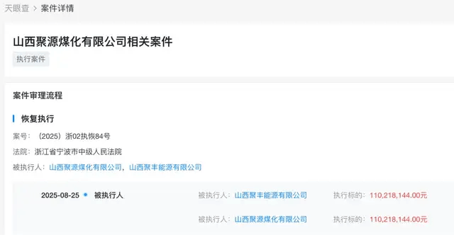 据天眼查显示,山西聚源煤化已于2025年8月被浙江省宁波市中级人民法院列为被执行人,执行标的1.1亿元。