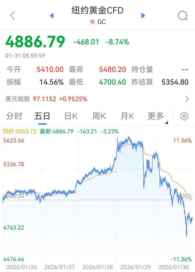 在经历了此前的一轮强势上涨后,国际金价银价出现大幅下跌。美东时间1月30日下午,纽约商品交易所4月黄金期价一度跌破每盎司4800美元关口,跌幅超过10%;3月白银期价一度跌破每盎司80美元关口,跌幅超过30%。