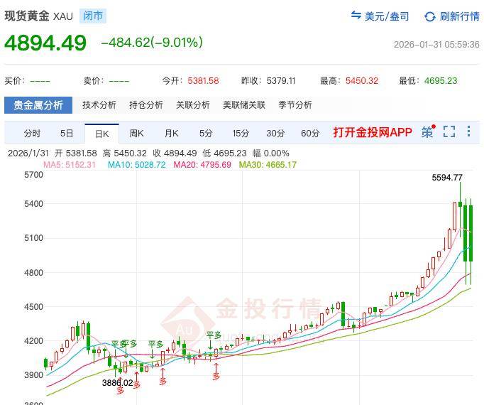 北京时间1月31日,现货黄金收盘价为4894.49美元/盎司,跌幅超过9%,一夜跌回1月21日的价格,盘中一度跌破4700美元。白银收盘价84.63美元/盎司,大跌近27%,最低跌至77.7美元。