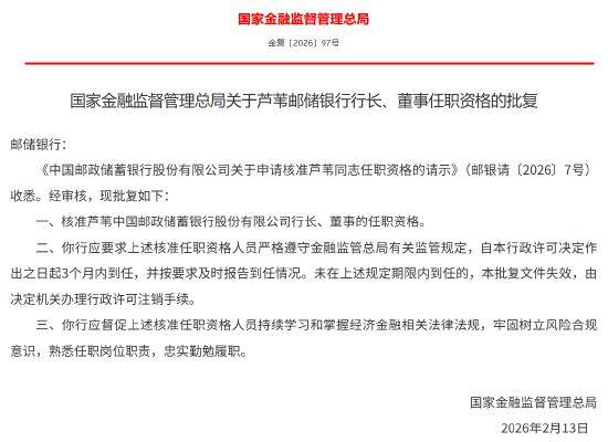 3月2日,国家金融监督管理总局近日发布批复,核准芦苇中国邮政储蓄银行股份有限公司行长、董事的任职资格。