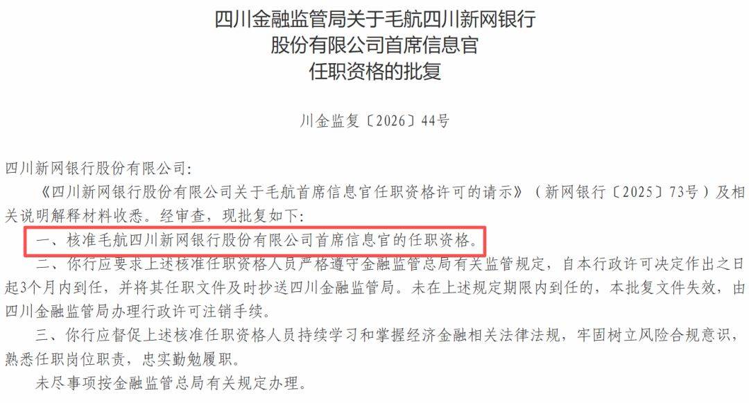 近日,四川金融监管局发布任职批复,核准毛航四川新网银行股份有限公司(下称“新网银行”)首席信息官的任职资格。