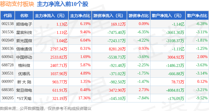从资金流向上来看,当日移动支付板块主力资金净流出29.5亿元,游资资金净流入5.46亿元,散户资金净流入24.04亿元。移动支付板块个股资金流向见下表: