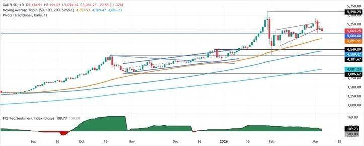 FXStreet分析师Christian Borjon Valencia指出,黄金价格走势依然积极,但如果跌破5000美元/盎司关口,金价可能走低。相对强弱指数(RSI)显示,动能正在转为负值。RSI加速下跌至中性水平,表明买家不愿推高价格。