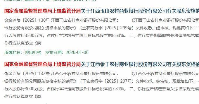 在此背景下,2026年以来中小银行增资动作呈现“批发式”落地特征。仅1月4日至6日这3天,就有超过30家银行的增资计划获得监管批复,这些银行覆盖广西、河北、四川等多个省份。国家金融监督管理总局上饶监管分局更是在1月6日单日批复了近10家农商行的增资计划。