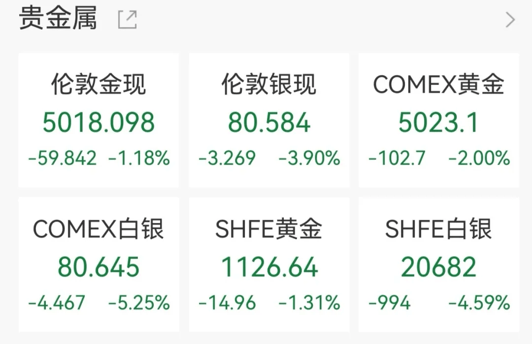 国际贵金属普遍收跌,现货黄金三日连跌,日内下挫1.18%报5018.098美元/盎司。现货白银则下挫近4%,日内一度跌破80美元关口。