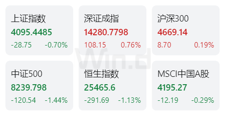 中国市场方面:上证指数下跌0.70%,深证成指上涨0.76%,沪深300指数上涨0.19%,中证500指数下跌1.44%;恒生指数下跌1.13%。
